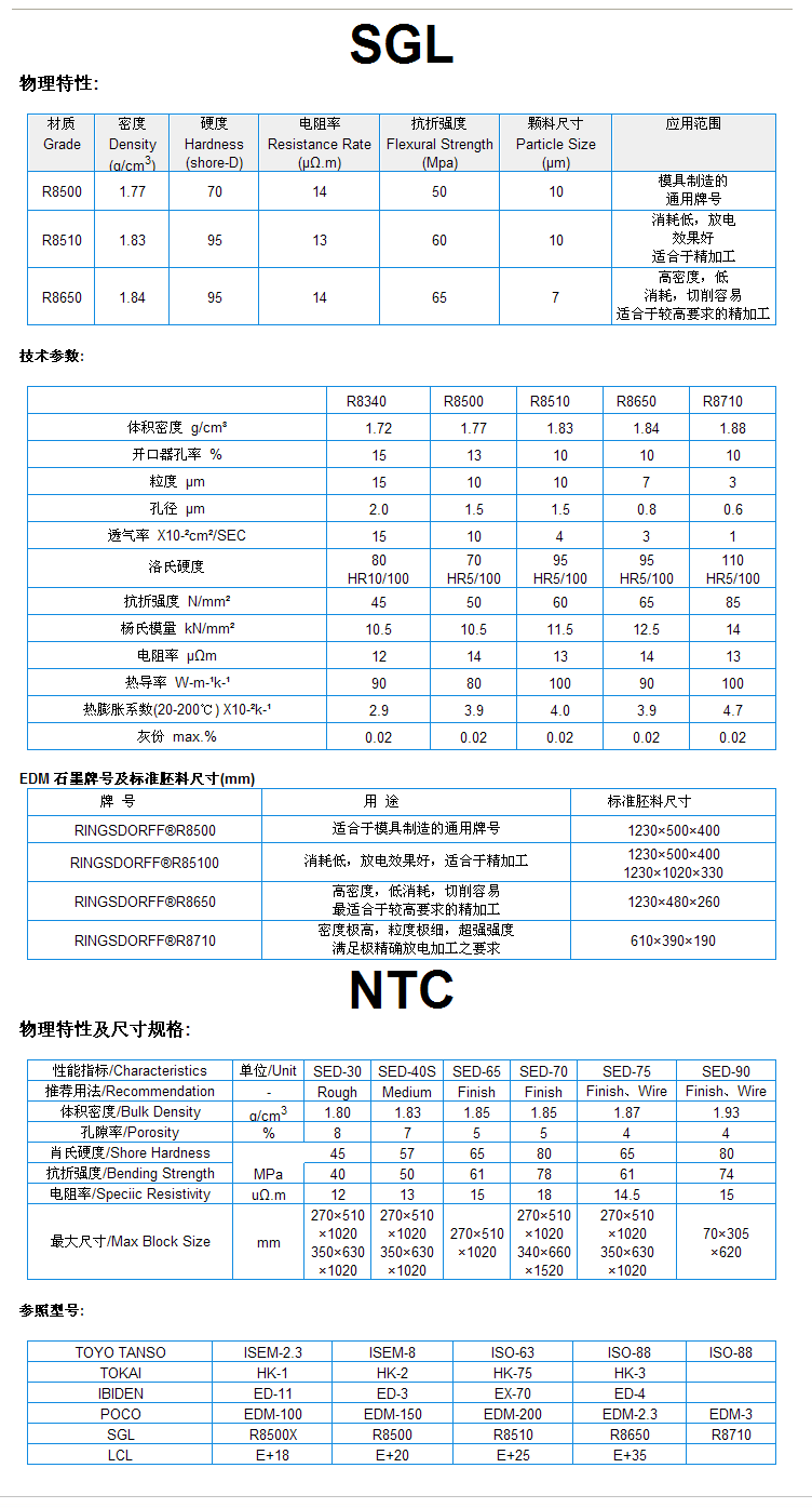 德國(guó)西格里石墨,日本東洋石墨,日本東海石墨,NTC石墨對(duì)應(yīng)牌號(hào)表及相關(guān)物理參數(shù),供參考